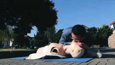 口对口人工呼吸:压额、捏鼻、包口吹气(双唇包绕病人口部形成封闭腔,用力吹气,吹气时间1s以上)。用眼睛余光观察病人胸廓是否抬起。吹气量500~600ml。吹毕,松开鼻孔1-2s,注意观察胸廓复原情况,见胸廓抬起即可。吹气两口后,立即进行胸外心脏按压。