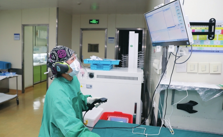 接收手术室使用后的腔镜,江国芳首先查看器械的结构及完整性,清点数量,将其录入信息系统,系统自动生成的条形码作为其“身份证”,扫描条码便可获知处理此包的过程和使用患者的信息,实现了复用器械处理和使用情况的可追溯管理。