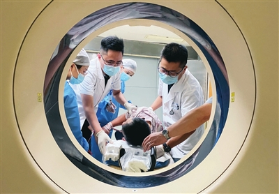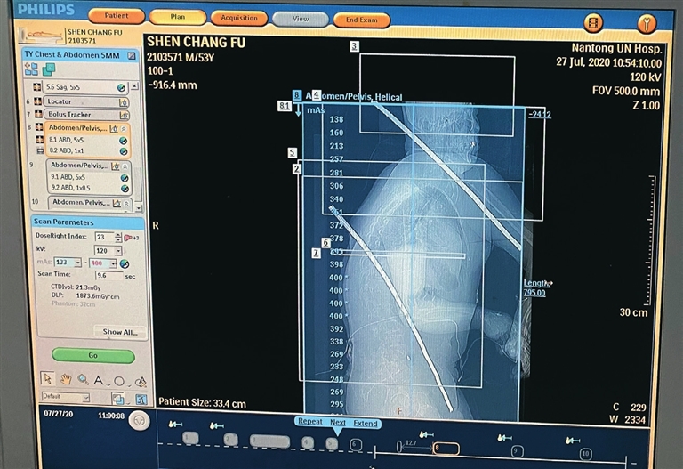 随后伤者被紧急送至CT检查,为了确保安全,急诊外科医师丁剑锋、心胸外科史辉博士全程陪同。万幸的是,经过CT检查发现,左颈部被刺穿的钢筋与主动脉相距只在毫厘间;右胸腹部的钢筋也与颈部血管神经、肺、肝脏等重要脏器擦肩而过。就连医生也感叹,这样的意外伤竟是如此的幸运。