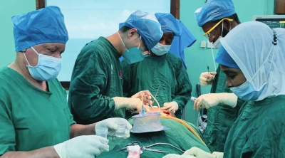 “It's nice.Chinese doctor,great!”纳兹莫加医院手术室,中国第31期援桑给巴尔医疗队麻醉医师陈红生正在指导当地麻醉医师为患有干皮症的患者小莫(化名)进行麻醉诱导,“准备可视气管内窥镜,对导管塑形,打开口角,顺利把导管置入口内,沿着舌体找到会厌看到声门……”