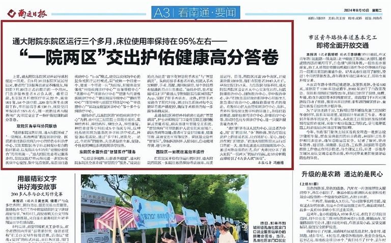 “随着东院区的启用,通大附院进入了‘一院两区,东西两翼’的发展新阶段,东西院区秉持一体化、同质化运行,特色化、差异化发展的理念,实现‘一体化管理、同质化运行、差异化布局、特色化服务’。医院着重打造以疾病为中心的特色专科诊疗中心,实现双院区各学科之间有分有合的协同联动,以及临床专科方向‘更细分更综合’的有机统一。”院党委书记施炜介绍。