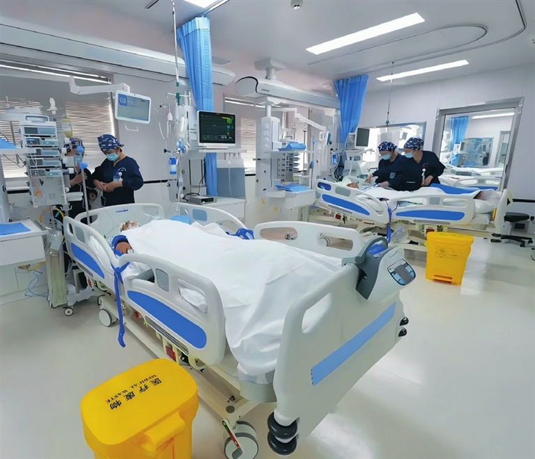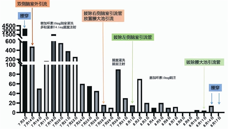 神经重症监护病区主要收治重型颅脑损伤和脊髓损伤、严重中枢神经系统感染、中重型急性脑血管病、癫痫持续状态、需要生命支持的围手术期神经外科患者、脑源性多器官功能障碍、其他进展性神经系统重症患者等。此次救治的患者,因头晕头痛伴嗜睡症状被紧急送往当地医院,后确诊为脑室积血并接受脑室外引流装置置入术。然而,术后患者出现高热、意识下降及多重耐药鲍曼不动杆菌感染的严重情况,病情危急。转入通大附院后,神经外科重症监护团队迅速介入,采用创新的“阶梯式脑脊液治疗”策略,通过腰大池和侧脑室的脑脊液灌洗、引流、鞘注等技术,有效控制了颅内感染,挽救了患者的生命。
