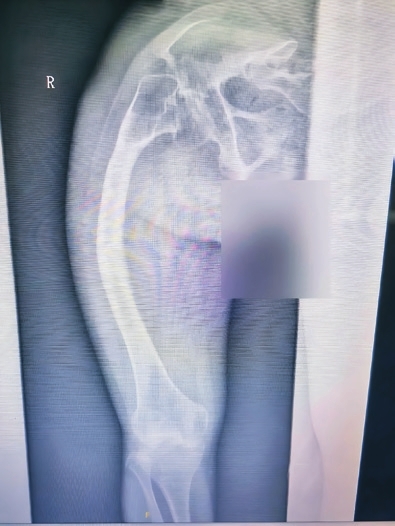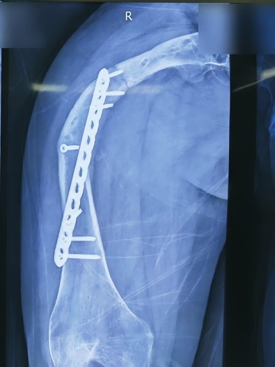 原来,张女士从小就患上了一种怪病,这导致她本身的骨头质量很差,骨头的强度也不够,右侧大腿严重向外弯曲。祸不单行的是,2021年,张女士不慎发生了车祸,她的右侧大腿股骨干被撞骨折。当时张女士采用了传统钢板内固定方法进行治疗。随着时间的推移,张女士骨头逐渐痊愈。谁料就在今年2月,张女士又再次发生车祸,仍然是右侧大腿股骨发生了骨折,这使得张女士被迫再次接受手术,腿骨又一次用钢板固定起来。经过一段时间的休养,张女士重新恢复了自主行走。然而,今年7月,命运似乎又和张女士开起了玩笑。有一天,张女士在家不经意地从座椅上站起时,只听见“嘎巴”