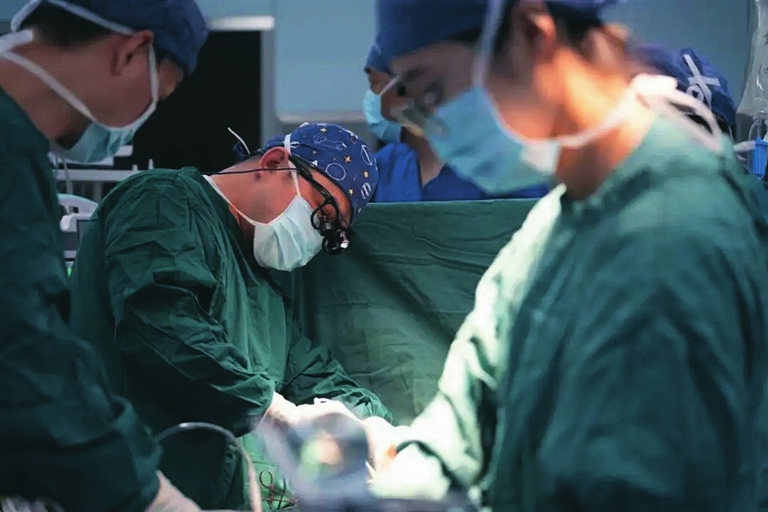 手术当日,在麻醉手术科、体外循环等多学科团队配合下,秦卫团队在无影灯下精细操作,开胸、建立体外循