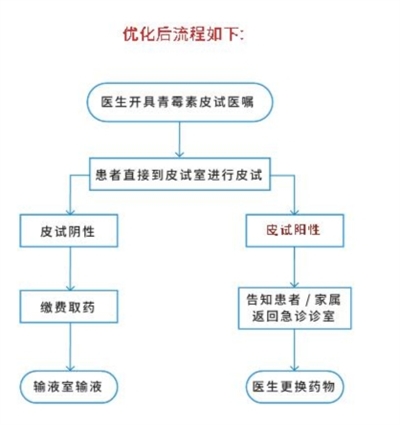 医生开具青霉素皮试医嘱后,患者直接到皮试室进行皮试,若皮试为阴性,患者缴费取药后到输液室输液;若皮试为阳性,请患者返回急诊诊室,医生将为您评估情况并更换其他安全药物。头孢类抗生素皮试流程保持不变。